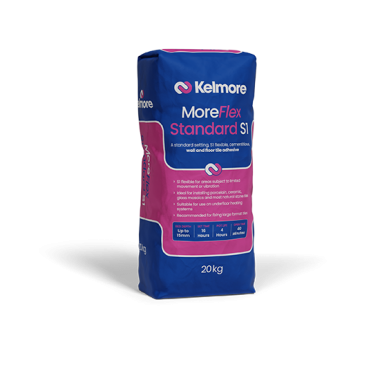 Kelmore’s MoreFlex Standard S1 is a highly polymer modified, flexible, standard setting, cementitious tile adhesive for walls and floors. This deformable adhesive has excellent bond strength and flexibility ensuring numerous types of tiles, such as porcelain, ceramic and most natural stone can be confidently fixed to a wide range of backgrounds, including those subject to limited movement and vibration. Allowing bed depths up to 15mm, MoreFlex Standard S1 has a long pot life of 4 hours and an excellent open time of 40 minutes, whilst still being set and ready for grouting after 16 hours. Showing its true versatility, this adhesive is suitable for interior and exterior use, as well as in wet areas, including swimming pools. It is suitable for use on underfloor heating systems, and it is particularly recommended for fixing large format tiles.